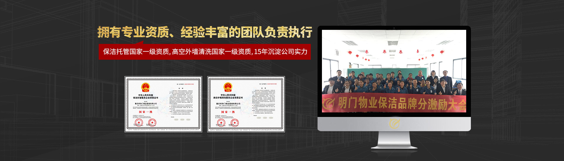 現(xiàn)有員工800多名,100%持證上崗,更有外墻清洗、開荒清潔等專業(yè)服務人員200余名